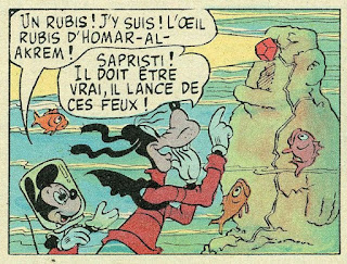 Publié à l'origine par Dell Comics dans Four Color #343 au mois d'août 1951 avec une couverture signée par Dan Gormley, The Ruby Eye of Homar-guy-am scénarisé par Don Christensen et dessiné par Paul Murry a été publié en France sous la forme de 9 épisodes d'une page chacun dans Le Journal de Mickey n° 82 à 90 entre le 20 décembre 1953 et le 14 février 1954.