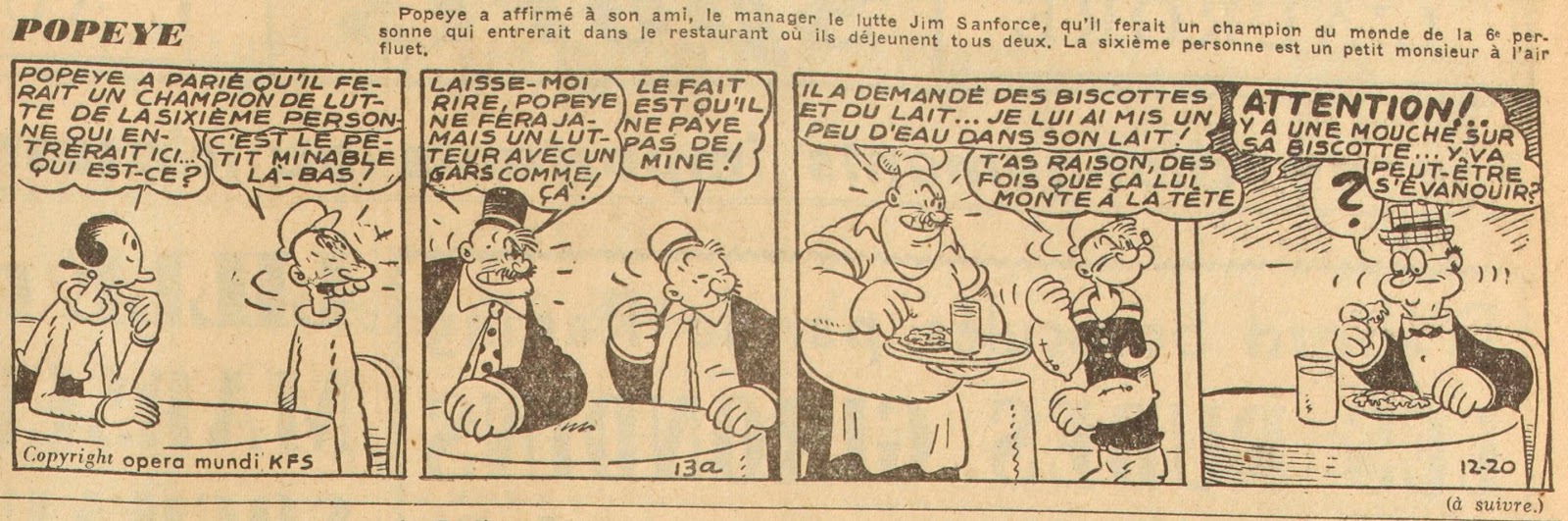 Entre le 26 mars et le 8 octobre 1946, le magazine hebdomadaire de cinéma Cinévie publie sous le titre "Les nouvelles aventures de Popeye dit Mathurin", 28 sunday pages du Thimble Theatre de Tom Sims et Bela Zaboly dessinées entre le 16 décembre 1945 et le 30 juin 1946.